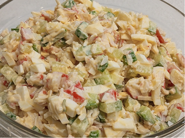 Состав салата: - крабовые палочки – упаковка 200 гр.; - свежий огурец – 1 шт.; - яйца – 4 шт.; - майонез – 1 ст. ложка или по вкусу. Вот и все ингредиенты. Осталось отварить яйца в течение 10 минут с добавлением щепотки соли, чтобы легче очистить после охлаждения в холодной воде, все ингредиенты нарезать, добавить майонез и перемешать. Свежий огурец нарезала мелким кубиком в глубокую емкость. Отварные, очищенные яйца нарезать мелким кубиком добавить к нарезанным огурцам. Нарезать крабовые палочки, добавить к огурцам, отварным яйцам, заправить майонезом, перемешать и подать к столу. Приятного аппетита. Заходите в гости для просмотра других рецептов. Подписывайтесь, пишите комментарии, делитесь своими рецептами и не забудьте поставить пальчик вверх. Смотрите подборку рецептов салатов в Дзен студии Перчик Астрахань.