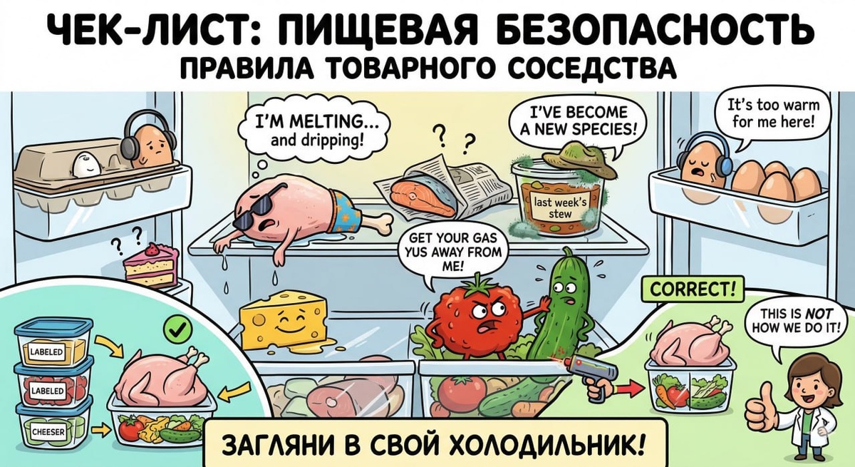 Многие уверены: если продукт не пахнет «странно», его можно есть. Но большинство патогенных бактерий не имеют ни вкуса, ни запаха. Пищевая безопасность начинается не в магазине, а в вашем холодильнике. Ловите краткий гид по товарному соседству и правилам хранения, которые уберегут ваш ЖКТ от неприятных сюрпризов. 1. Золотое правило «Верх — Низ» Распределение продуктов в холодильнике должно идти от «готового к употреблению» к «сырому»: Верхние полки: Готовая еда, остатки ужина в контейнерах, сыры, йогурты. Средние полки: Колбасные изделия, яйца (в основной камере, а не на дверце!). Нижняя полка: Самое холодное место. Здесь храним сырое мясо, птицу и рыбу. Почему? Чтобы капли мясного сока случайно не попали на продукты, которые вы не будете термически обрабатывать. 2. Секция для овощей и фруктов Не смешивайте: Яблоки, бананы и томаты выделяют этилен — газ, который заставляет соседнюю зелень и овощи гнить быстрее. Без пластика: Вынимайте овощи из магазинных пакетов. В них скаплива