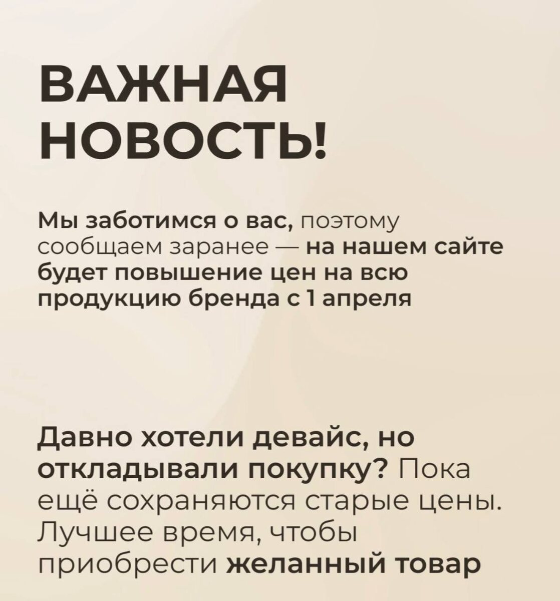 Если вы планировали дополнить свою систему ухода новым девайсом или пополнить запас нутрицевтиков, сейчас — самое рациональное время для покупки по прежним ценам.
