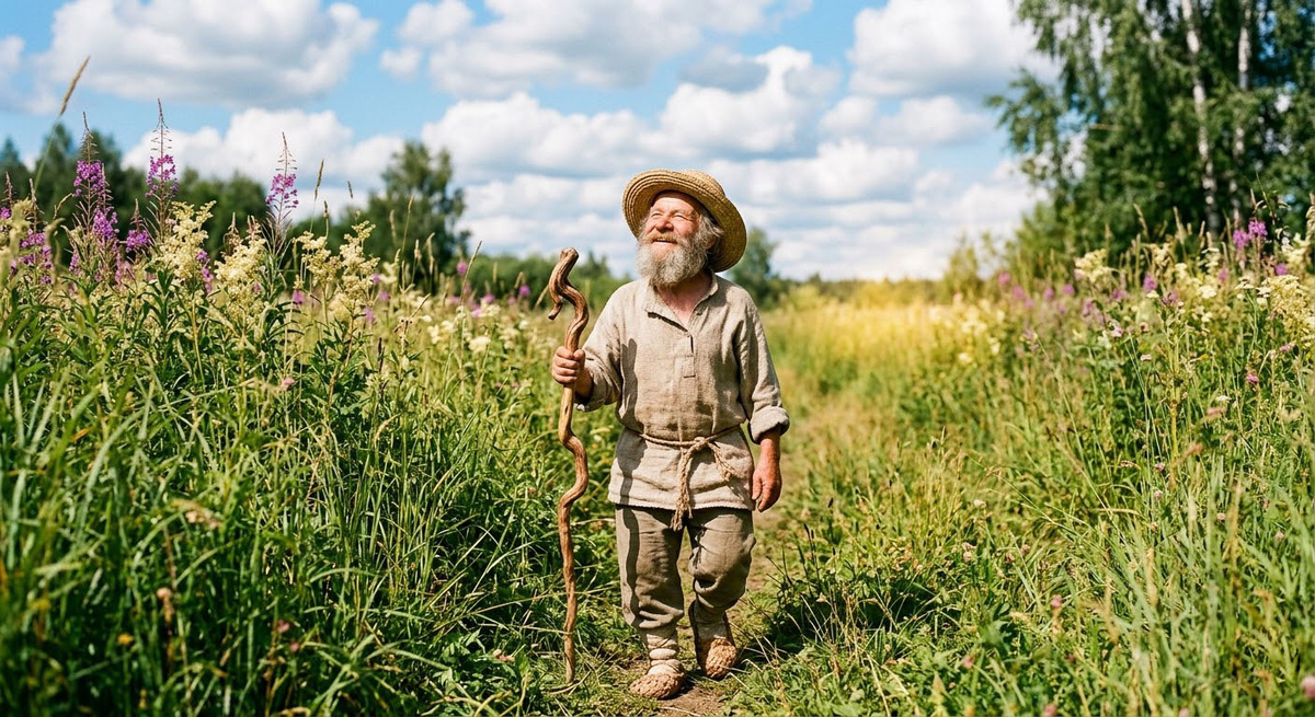 Будто из густой травы выходит к нему маленький старичок — ростом не выше самой травы. На голове у него соломенная шляпа, на плечах простая самотканая рубаха, подпоясанная верёвкой. Штаны холщовые, на ногах лапти. В руке посох — коряга изогнутая, словно самой землёй выточенная.