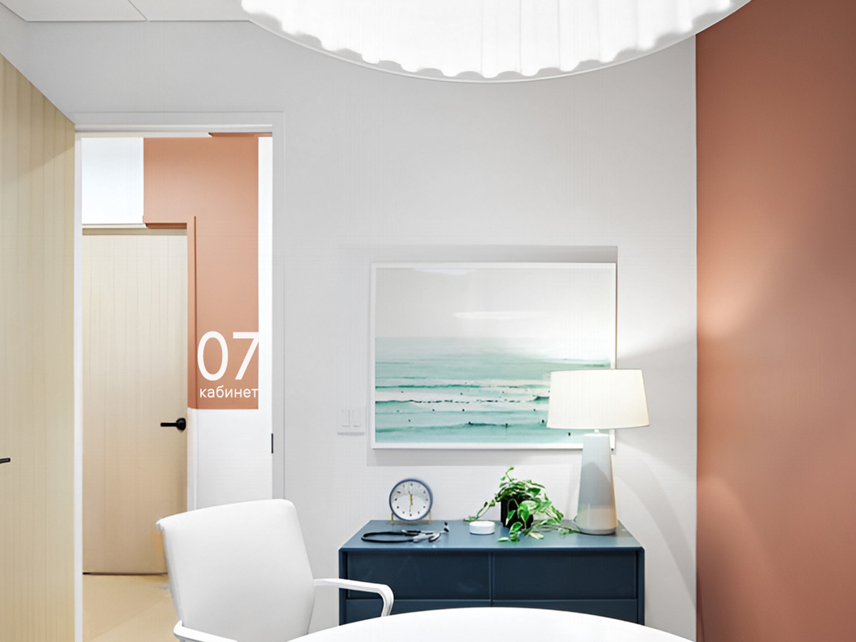 В медицинских клиниках мятные, лавандовые и приглушённо-зелёные тона в зонах ожидания снижают уровень тревоги. Пациенты спокойнее переносят ожидание приёма и меньше нервничают перед процедурами.