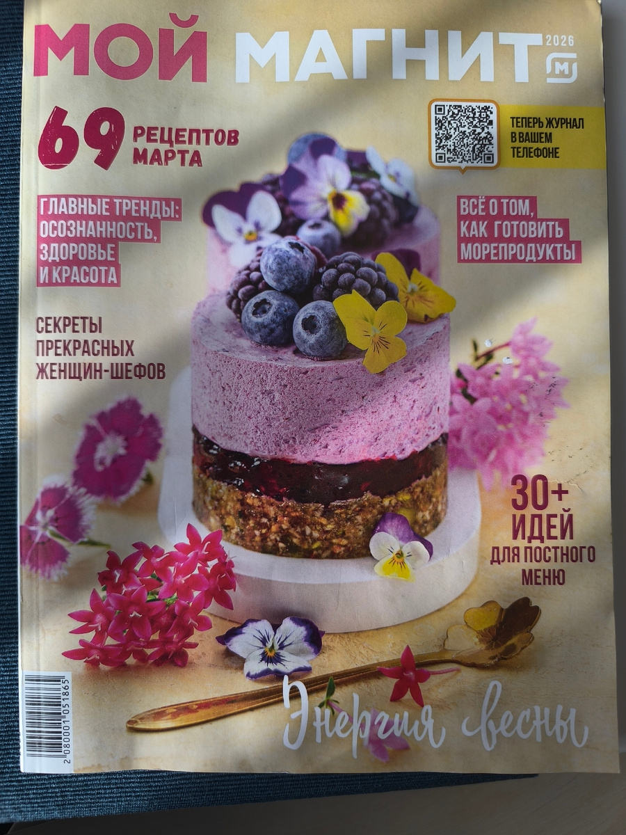 Сегодня на завтрак у нас кулинарный эксперимент. Вдохновением для него послужил журнал "Мой магнит" с мартовским рецептами. Надо отметить, что этот журнал уже давно перешагнул статус каталога продуктов. В настоящее время этот журнал кулинарных рецептов с отличными фотографиями и пошаговыми инструкциями для некоторых рецептов, продукты для которых можно купить в прямо в магазине. Также в журнале уделяется место для рассказа о разных продуктах, например конкретно в этом номере рассказывается о морепродуктах и итальянских винах. Попробуйте навести телефон на кьюаркод на обложке, и вы получите журнал с рецептами в своем телефоне.