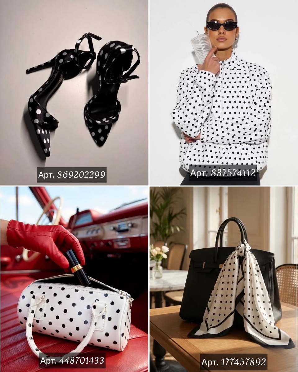 Очень изящная деталь, которая способна мгновенно сделать образ более продуманным, женственным и дорогим. Платок в чёрно-белой гамме с рисунком в горох — это аксессуар, который работает сразу в нескольких направлениях: он добавляет графику, завершает образ и создаёт ощущение утончённой стилизации.