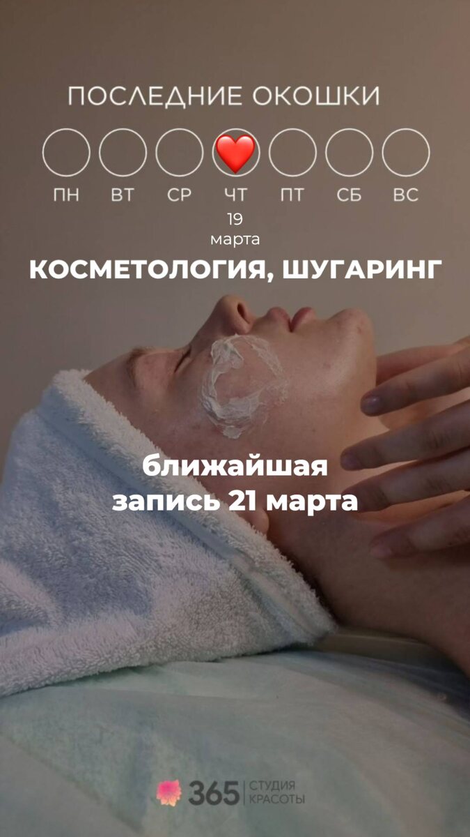 🌺 Пусть каждая процедура в нашей студии дарит вам радость и уверенность в своей красоте. 😇🤍 #красота #наслаждение #забота #весна #любовь #мечты сбываются #радость #возможности ЧТО МОЖНО УСПЕТЬ СДЕЛАТЬ 19 марта 2026 года : Ногтевой зал: 10:00 12:00 14:00 16:00 18:00 Сет в 4 руки: 14:00 20:00 Парикмахерский зал: 16:00 18:00 20:00 Оформление бровей и ресниц: 11:00 13:00 16:00 20:30 Косметология/шугаринг: Ближайшая запись 21 марта ЗАПИСАТЬСЯ МОЖНО ЛЮБЫМ УДОБНЫМ СПОСОБОМ: 👉🏻 Сообщение в Whats'app https://wa.me/79663654477 👉🏻По телефону +79663654477 👉🏻Онлайн запись https://n286444.yclients.com/ #команда365 #красота #наслаждение #забота #весна #март #любовь #мечтысбываются #радость #возможность