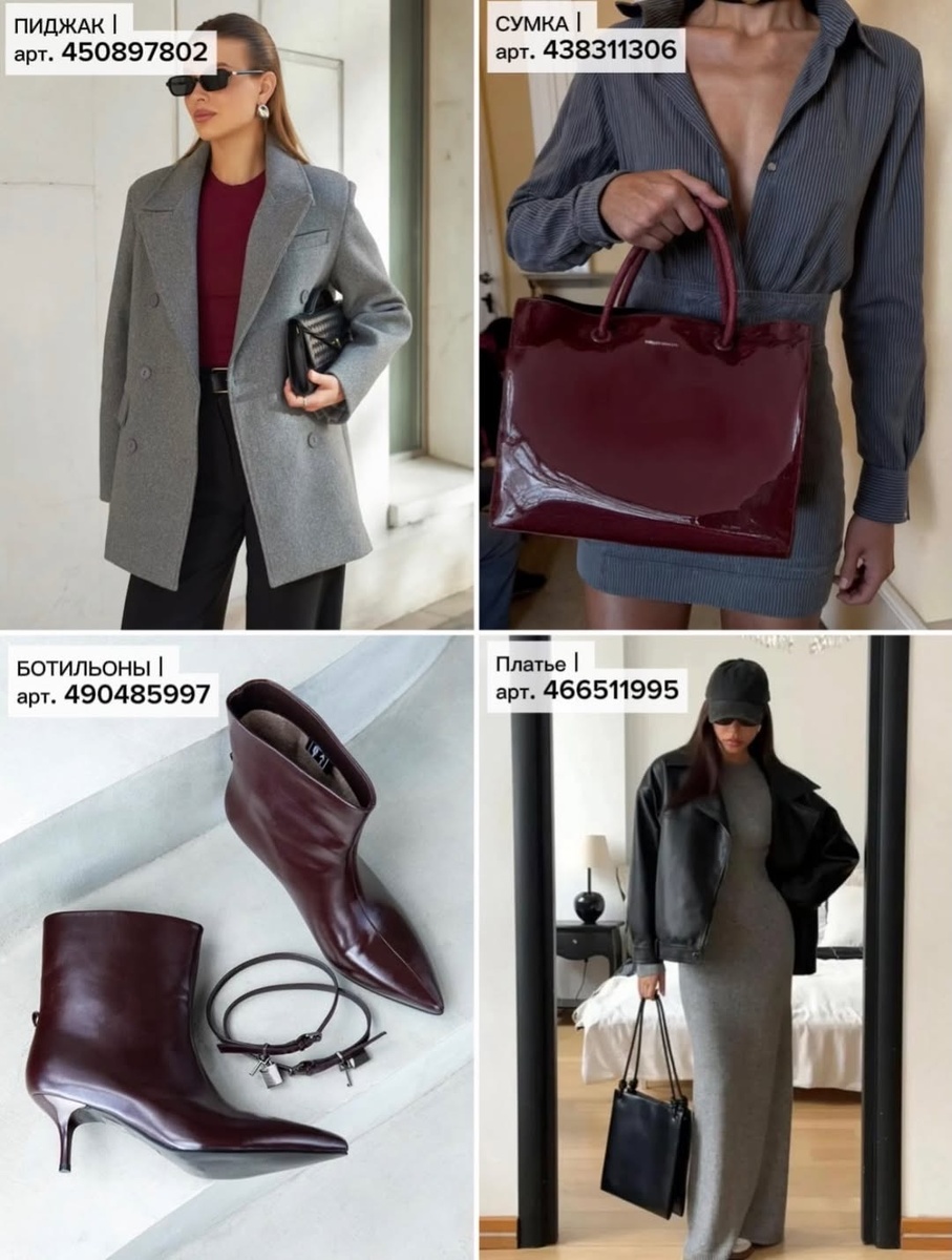 Эта подборка с ВБ получилась особенно красивой, глубокой и взрослой. Здесь нет случайной яркости, поверхностной декоративности или вещей на один выход. Напротив, перед нами редкое сочетание силы, элегантности и носибельности. Серый пиджак задаёт архитектуру образа. Винная сумка и ботильоны добавляют драматичную роскошь. Серое платье привносит лаконичную женственность. Шоколадная юбка делает гардероб богаче и выразительнее. Оливковый свитер смягчает и согревает. Чёрная сумка с золотистыми деталями отвечает за вечную классику. Оливковые балетки завершают всю эту историю тонкой, интеллигентной нотой.