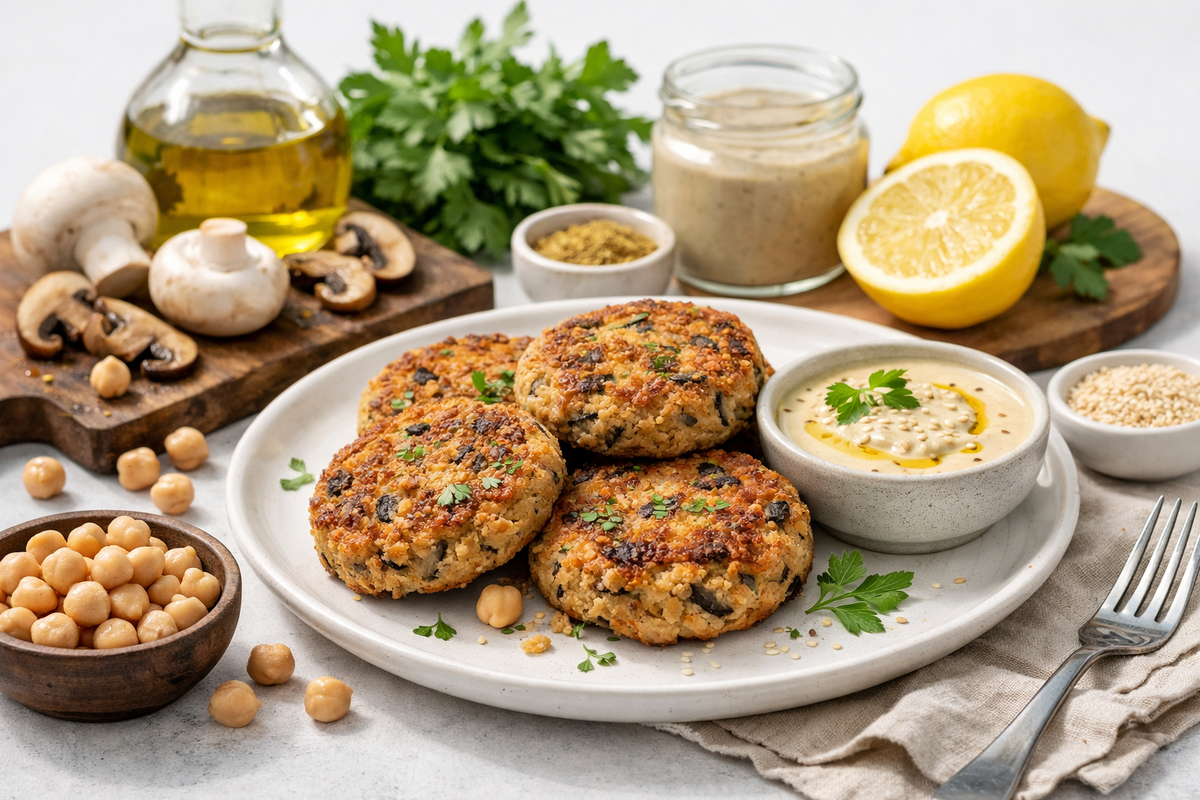 Нутово-грибные котлеты с лимонно-тахинным соусом