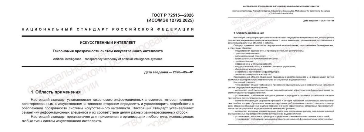 🟣 ГОСТ Р 72563-2026 «Информационные технологии. Искусственный интеллект. Ситуационная видеоаналитика. Методология определения значений функциональных характеристик». Методичка для систем автоматизированной видеоаналитики (кроме биометрии). Описывает, как тестировать такие системы, считать их реальные характеристики и проверять, соответствуют ли они заявленным. Работает в ЖКХ, транспорте, энергетике, на промобъектах и в безопасности. Действует с 1 марта 2026 года. 🟣 ГОСТ Р 72515-2026 «Искусственный интеллект. Таксономия прозрачности систем ИИ». Простыми словами: определяет, какую информацию о работе нейросети нужно раскрывать, чтобы заинтересованные стороны понимали, почему система приняла то или иное решение. Вступает в действие с 1 мая 2026 года. «Альянс Цифровых Лидеров в стройке» в MAX #законы #ии