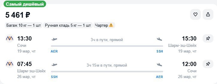 руб., включая перевозку чемодана. Бюджетный вариант рейса подойдет туристам, легким на подъем: отправление в Египет уже завтра, 19 марта, обратно – через неделю 26-го. Наличие и цены мы проверяли в 18:30. @tourdom
