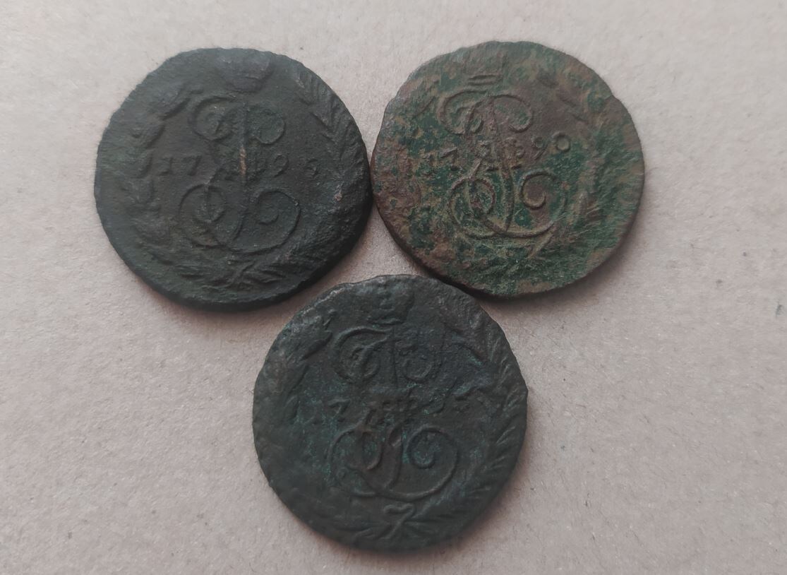 В моих коллекционных закромах довольно много пятаков времен Екатерины, монет номиналом деньга и полушка времен Екатерины, а вот с другими медными номиналами времен Екатерины Второй - совсем уныло. К примеру, нет ни одной монеты в 2 копейки и всего лишь 3 монетки номиналом в 1 копейку. Монетки - большие, монетки - красивые, сохранность - самая обычная, гурт - сетка. Всадник, поражающий змия, хорошо сохранился на всех монетах. Точно также на всех трех копейках отчетливо видно слово "копейка". Тут уж ни с чем не перепутаешь. На одной из монет - год совершенно не разобрать (последнюю цифру, но вроде бы 1795). Две другие копейки - 1790 и 1795 годов. Вполне обычные монетки с ценой на уровне 400-600 рублей. Удивительно, но факт - если заглянуть в нумизматический каталог, то можно увидеть, что номинал "копейка" во времена Екатерины не особо и был используем. Со всеми разновидностями существует лишь 24 варианта. Для сравнения можно посмотреть на медные пятаки, коих разных вариантов будет ч
