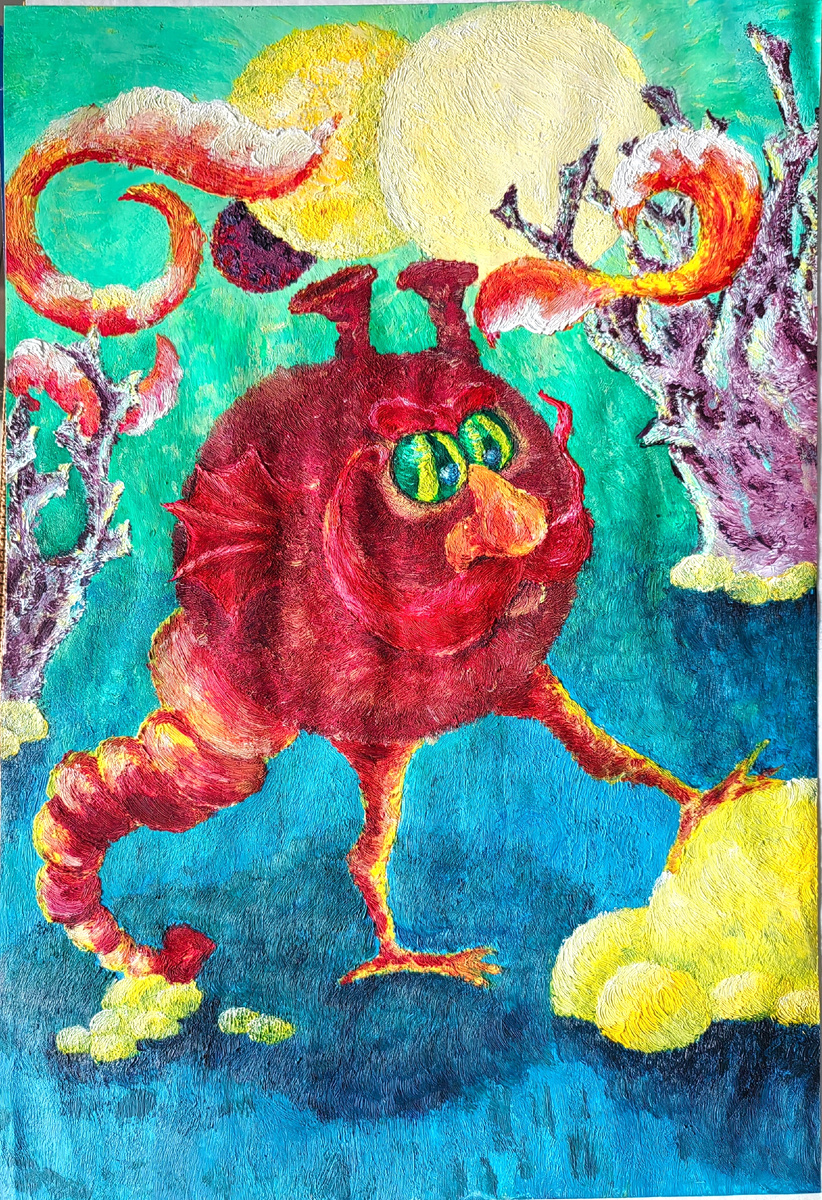 Узнать дядюшку Мо можно было сразу: круглый, словно воздушный шарик, покрытый мягкой терракотово-рыжей шерсткой цвета Марса, по которой то и дело пробегали озорные оранжевые искорки. Глаза у дядюшки Мо были особенными: арбузного цвета — зеленые в желтую полоску, — они сияли любопытством и добротой. Под ними уютно располагались густые усы. А на спине у него покачивался длинный хвост, как у скорпиона. Очень удобно кончиком такого хвоста чистить свои уши-локаторы, которые вращались в разные стороны, улавливая сигналы со всех концов галактики. Передвигался же этот удивительный путешественник на крепких куриных ножках, которые легко несли его круглое тело по любым планетам. Ему нравилось узнавать новые миры и открывать для себя новых, не похожих на него существ.