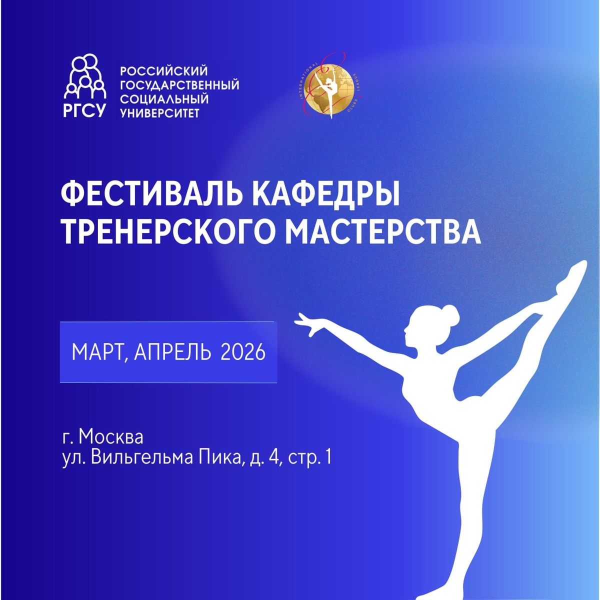 ✨ 23 марта 2026 года в рамках Фестиваля кафедры тренерского мастерства состоится открытая лекция ✔️Профессора кафедры тренерского мастерства РГСУ, доктора педагогических наук, профессора Ирины Александровны Винер. 📍Место проведения: Актовый зал (ул. Вильгельма Пика, д. 4, стр. 1) 🗒Дата: 23 марта 2026 года ⌛️Время: 14:00 – 15:30 👥Принять участие можно в качестве слушателя. Участие бесплатное, необходимо только заполнить регистрационную форму: https://forms.gle/wNhCHCVMbnmE8RTT7 —————————————————— 💍Фестиваль кафедры тренерского мастерства включает несколько событий: 📘Образовательная программа для спортивных судей, тренеров и специалистов по художественной гимнастике 🥇Студенческая Клубная Лига. Мастерский турнир 📖Презентацию книги по профессиональной подготовке тренеров 🧑🎓Открытые лекции ведущих специалистов —————————————————— 📌Чтобы стать слушателем лекции: — заполните анкету по ссылке — дождитесь подтверждения на почту 🧑🎓Заявки принимаются до субботы, 21 марта включ