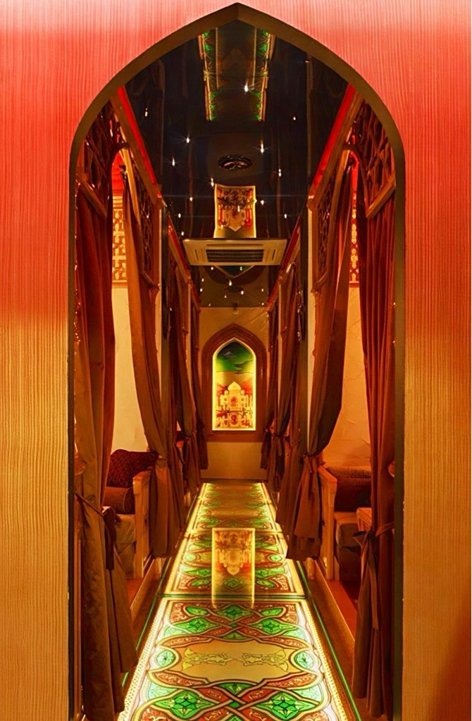 Это сердце ресторана, где царит благородный полумрак. Мягкий свет восточных светильников танцует на резных деревянных панелях, создавая атмосферу уюта и камерности. Здесь время течёт иначе — медленно, как горная река. Гости утопают в глубоких сидениях, наблюдая за выступлениями певца Улугбека, чей голос звучит на древних восточных языках, и кажется, что сами стены внимают этим мелодиям.