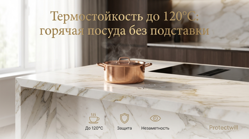 В прошлом месяце мы закрывали сложный частный объект в Барвихе. Затянули 45 квадратных метров натурального камня за два дня. Строго без демонтажа, без малейшего шума и строительной пыли. Теперь невидимая защита камня пленкой с официальной гарантией 7 лет позволяет владельцам совершенно спокойно ставить раскаленные сковородки прямо на рабочую зону.