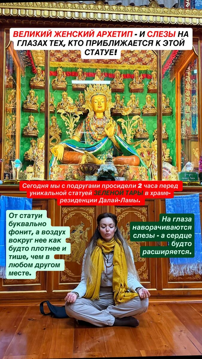 ! Сегодня мы с подругами просидели 2 часа перед уникальной статуей ЗЕЛЕНОЙ ТАРЫ в храме-резиденции Далай-Ламы. От статуи буквально фонит, а воздух вокруг нее как будто плотнее и тише, чем в любом другом месте. На глаза наворачиваются слезы - а сердце будто расширяется. Обе мои подруги ничего не знали о Зеленой Таре до того, как я дала им мантру и рассказала. Но обе сразу же почувствовали этот НЕВЕРОЯТНЫЙ ЭФФЕКТ! Статуя работает так глубоко и мощно еще и потому, что в нее заложен некий важный артефакт, привезенный спасавшимися монахами из Тибета. А еще мою подругу, которая прилетела раньше, сегодня остановили две монахини. Они увидели ее растерянные состояние. Отвели в храм. Посадили напротив статуи Зеленой Тары и начали читать мантры и молитвенные ритуалы. Она просидела так три часа, обливаясь слезами, ощущая, как уходят все обиды и вдруг возникает контакт со своим внутренним Женским. Со мной сегодня перед этой статуей произошло тоже нечто глубоко личное и мощное! И тогда я под
