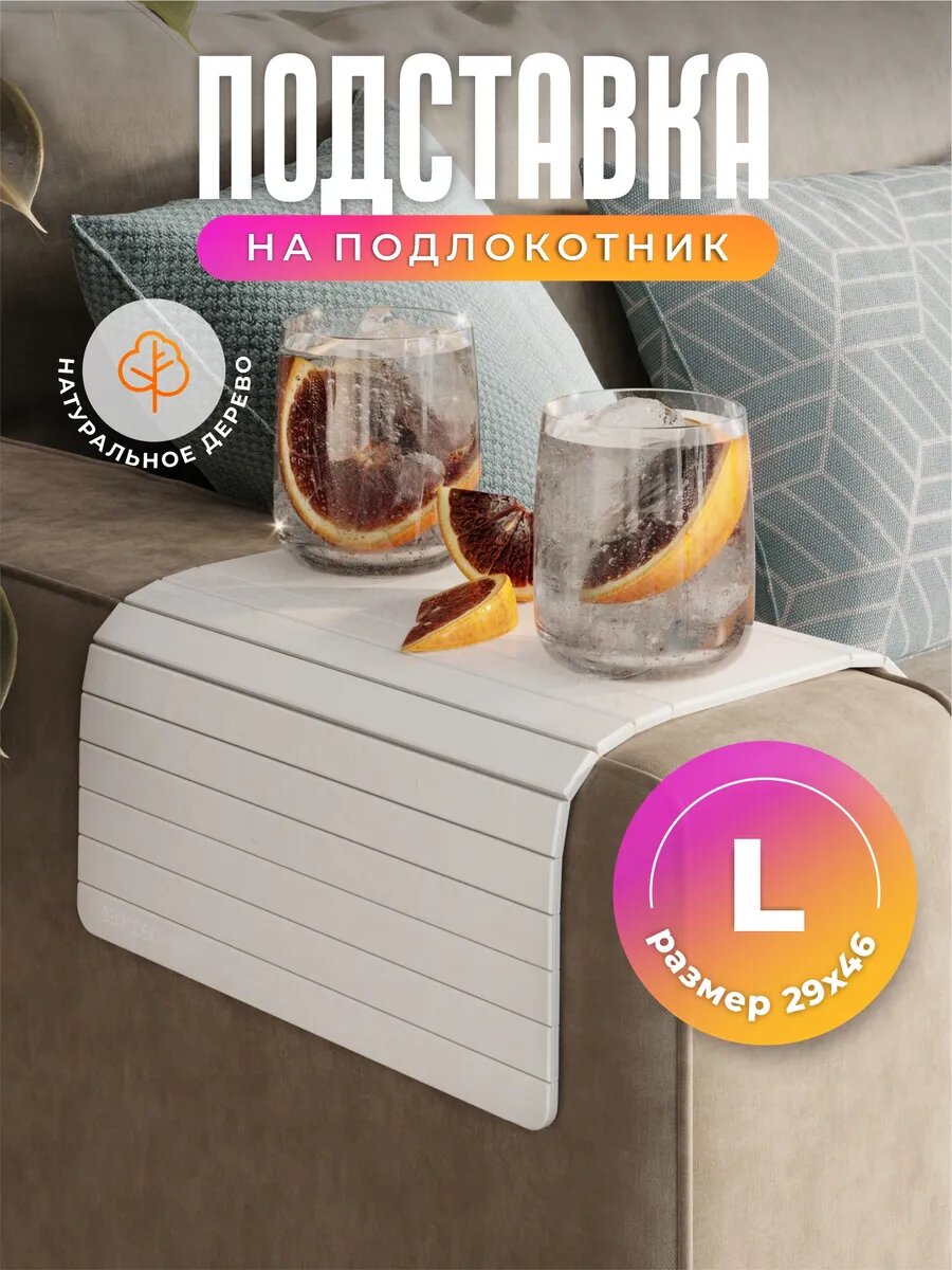 Гибкая накладка-столик отлично защищает мягкую мебель от повреждений и загрязнений. Она легко фиксируется на подлокотнике дивана или даже кресла. Выполнена накидка из дерева, это придает ей стильный вид, прочность и долговечность. Она имеет размер 29 х 46 см. Цена 1 519 рублей. Артикул 33517734