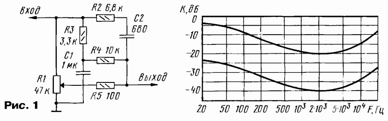 Большинство известных схем тонкомпенсированных регуляторов громкости (ТКРГ), за исключением, может быть, самых сложных, не нашедших широкого применения, не обеспечивает требуемого закона и глубины коррекции. В наиболее распространенных ТКРГ с имеющим отвод переменным резистором (или без отводов) [2] глубина коррекции НЧ не более 15 дБ, причем ее крутизна на частотах ниже