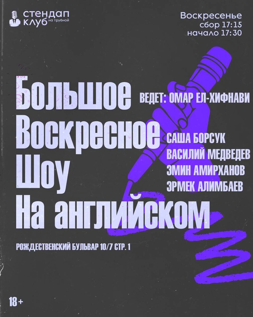 ❕ We're here under the brand new name 💖 Большое Воскресное Шоу На английском 💖 but are just as big, just as fun, and just as in English as we've always been! Sasha Borsuk 🧑🏼🏫 has taken classes in some interesting things 😏 Vasya Medvedev 😐 is the deadpan killer Emin Amirkhanov 🦸🏻♂️ has some problems with the logic of comic books Ermek Alimbaev 🐴 loves horses in many ways and our host Omar El-Hifnawy 🌶 wants to shared some of his thoughts about race, religion, and fairy tales Стендап Клуб на Трубной 🕢Time: 17:30-18:55 🗺️Address: Rozhdestvensky Blvd, 10/7 С1 🎟Entrance: FREE. 💸 Donations for the show are welcome, one drink minimum required 🍸 🔗Click to reserve seats here!