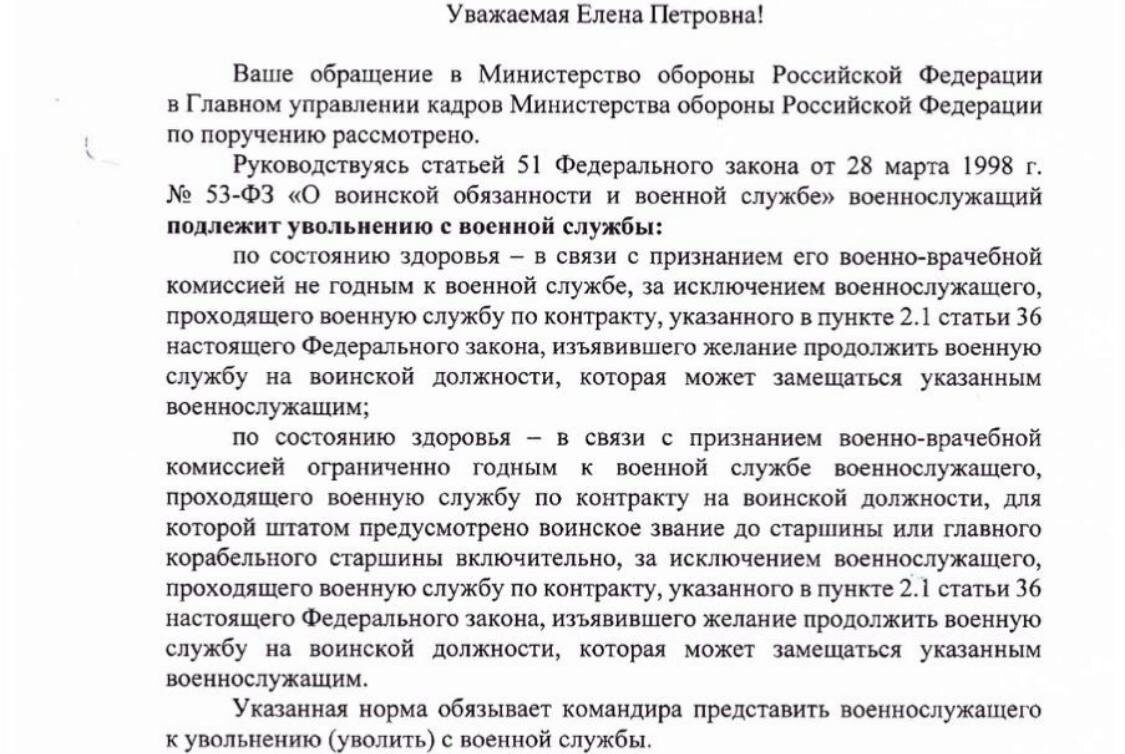 » Напоминаем, что одна из задач нашей Корпорации — правовая поддержка военнослужащих и содействие соблюдению их законных прав. 📑В январе 2026 года мы обратились в Министерство обороны РФ с вопросом о практике оформления служебных отношений с военнослужащими, имеющими ограничения по состоянию здоровья. Нас интересовало соответствие действующему законодательству случаев, когда военнослужащие, признанные ВВК негодными (категория «Д») или ограниченно годными (категория «В») к военной службе, переводятся к новому месту службы. На днях получен ответ из Управления кадров, который содержит важные правовые разъяснения. В своем ответе Управление кадров ссылается на статью 51 Федерального закона № 53-ФЗ «О воинской обязанности и военной службе». Данная норма устанавливает, что военнослужащий подлежит увольнению: ⏺в связи с признанием его военно-врачебной комиссией не годным к военной службе (категория «Д»); ⏺в связи с признанием его ограниченно годным к военной службе (категория «В») (для в