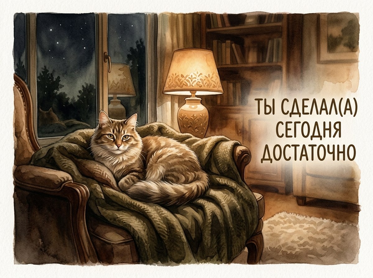 День уже сворачивает крылья, и вместе с ним ты имеешь право положить в сторону заботы, сомнения и тяжёлые мысли. Слышишь, как ночь укрывает окна мягким бархатом? Это мир шепчет тебе: «Ты сделал(а) сегодня достаточно». Я знаю, как трудно иногда просто позволить себе отдохнуть. Когда я сворачиваюсь клубком, мир не рушится — он лишь замирает, чтобы подождать меня. Так и ты можешь довериться этой тихой ночи. Пусть тёплый полумрак наполнит комнату, словно мягкий плед, а звёзды за стеклом охраняют твой сон. Засыпай с мыслью, что завтрашний день уже благодарен тебе за то, что ты есть.
