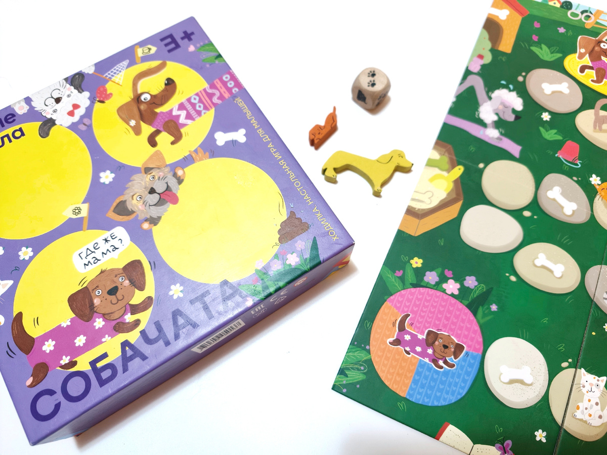 В прошлом обзоре я показала вам игру, связанную с кошками, и было бы несправедливо обойти вниманием и других домашних питомцев. Да, для любителей собачек у меня тоже есть отличный вариант (воистину фантазия составителей настольных игр безгранична!). Только в отличие от предыдущей, сегодняшняя наша коробочка относится к разряду первых игр малыша и ориентирована на возраст около трёх лет.