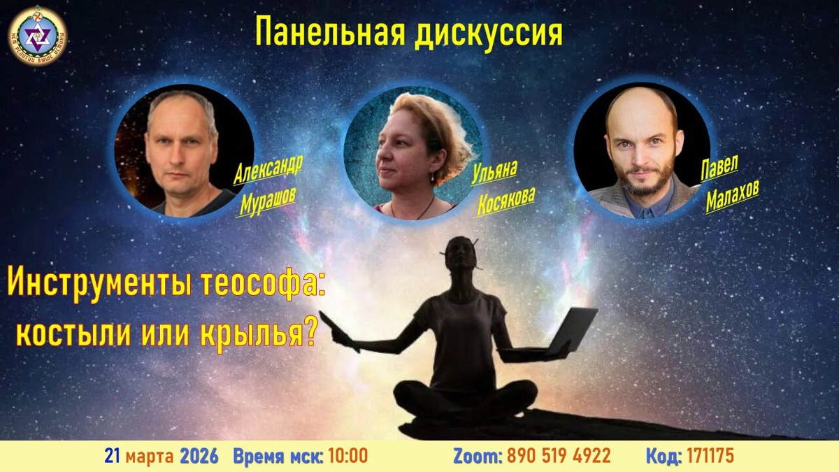 ! ✅ ТЕМА: "ИНСТРУМЕНТЫ ТЕОСОФА: КОСТЫЛИ ИЛИ КРЫЛЬЯ?" 📢 Беседу ведут: Александр Мурашов, Павел Малахов, Ульяна Косякова После трёх коротких выступлений приглашаем вас к обсуждению темы и обмену мнениями. 👉 Начало встречи, как всегда, в 10:00 утра по Москве. 🌐 ZOOM Id: 890 519 4922 Код: 171175 Быстрый вход в лекторий по ссылке: https://clck.ru/37Q6hC. Предварительная регистрация и установка программ - не нужны. Участие - бесплатное. ☀️ Добро пожаловать!