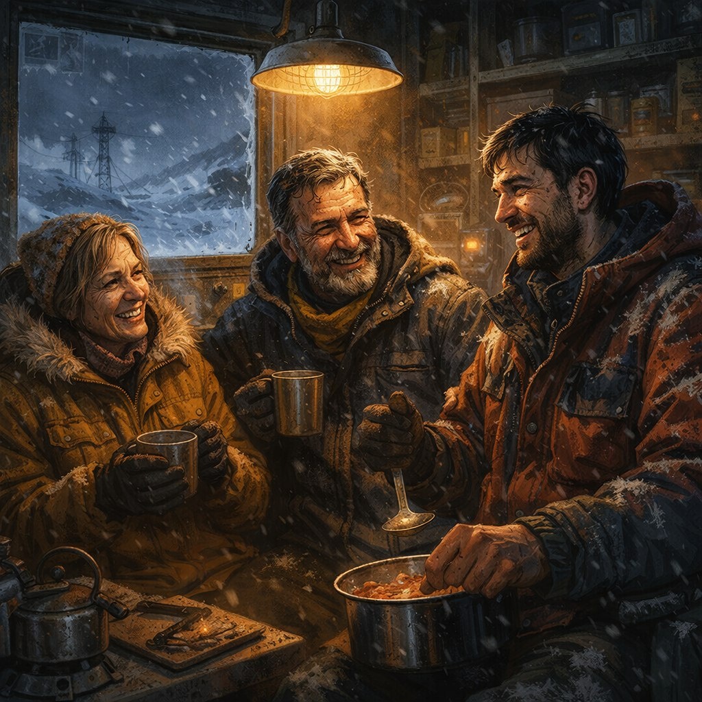 За столом, когда за тонкими стенами станции неистовствовала ледяная буря, Виктор разливал горячий чай и травил байки. Он рассказывал истории из экспедиций смешно, в лицах, с неподдельным задором, заставляя сурового Игоря хохотать до слез.