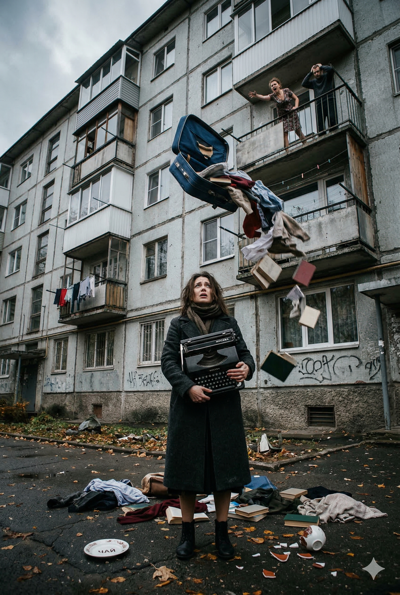 Ты ставишь печатную машинку на асфальт. Медленно расправляешь плечи. Твоя спина прямая, хотя внутри всё выжжено и пусто. Ты смотришь вверх, на балкон, где Света уже замахнулась твоей коробкой с письмами.