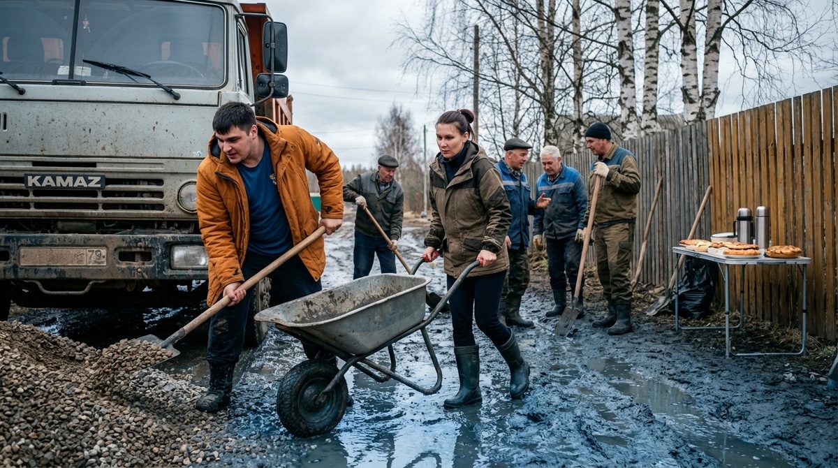 И вот тут произошло то, чего я, честно говоря, не ожидал. Вышли все. Вообще все. Мужики с лопатами, парни помоложе — с тачками. Пришли женщины — не просто посмотреть, а работать. Люда с пятого дома встала рядом с мужем и лопатой ровняла щебень наравне с ним. Таисия моя вместе с соседками — Галиной и Ниной — организовали стол у наших ворот: пироги с капустой, картошка в кастрюле, термосы с чаем. Не для красоты — реально работали весь день, подносили, убирали, следили чтобы никто не замёрз.
