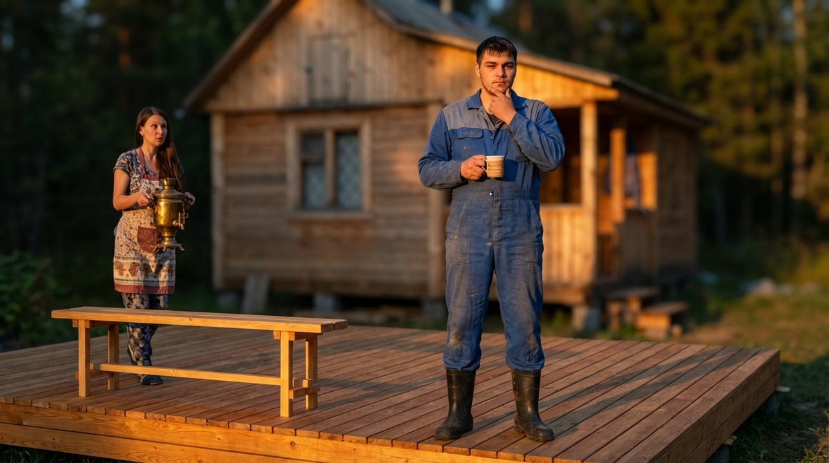 Мы сидели и молчали. Просто сидели. Слушали, как где-то в траве стрекочет — то ли сверчок, то ли кузнечик, не разбираюсь я в них. Сосед Петрович прошёл мимо забора, остановился, посмотрел. Говорит: "Хорошо сделал". Я говорю: "Садись, чаю налью". Сел. Выпил две кружки, расспросил про лиственницу, про масло, про тумбы. Записал что-то на телефон.