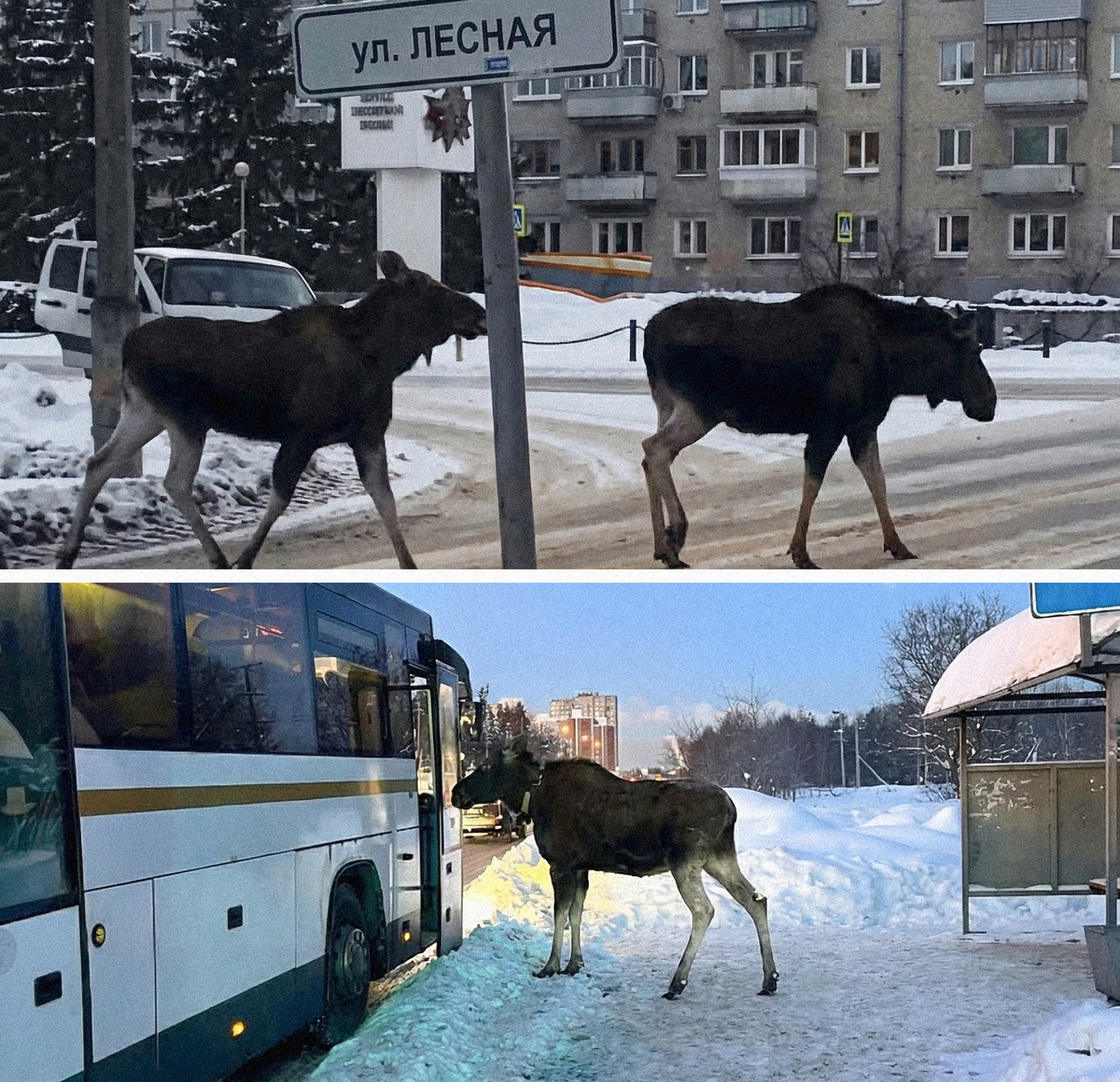 В социальных сетях в последние дни появляется все больше фотографий, на которых запечатлены лоси, вышедшие из леса к людям. Вот лось на остановке общественного транспорта, другой – во дворе многоэтажек, третий собирается перейти дорогу.