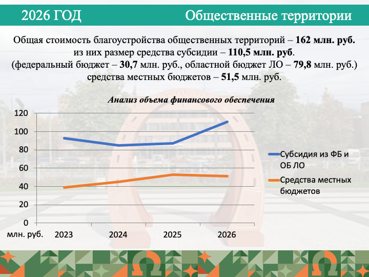 Объем финансирования на реализацию мероприятий по благоустройству общественных территорий в прошлом, 2025 году, составил 140 млн. руб. на Тосненский район, из них размер субсидии 87 млн. руб., средства местных бюджетов – 53 млн. руб. Размер субсидии вырос на 27 %