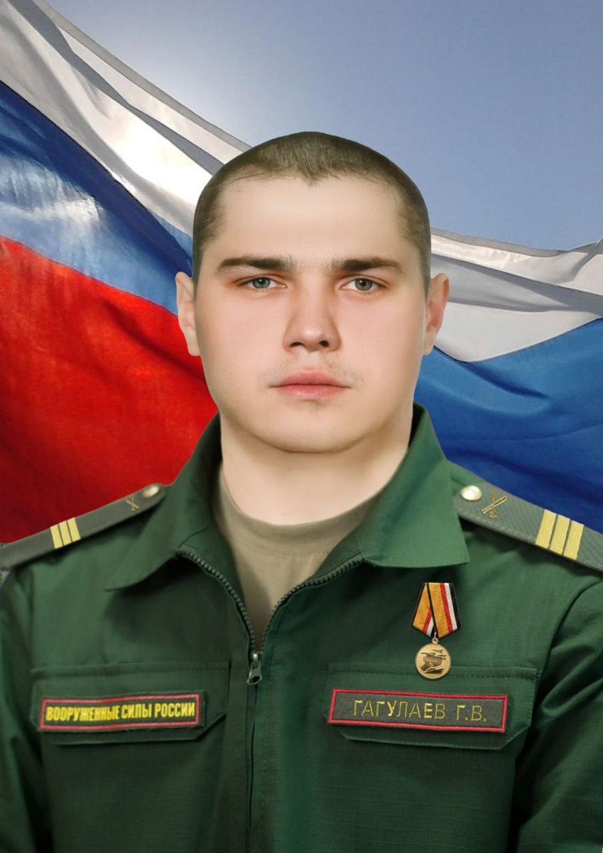 ), пал смертью храбрых при исполнении воинского долга на Запорожском фронте СВО 18 марта 2022 года... Сын ветерана боевых действий, Георгий шëл по стопам отца и стал профессиональным военным, настоящим воином, бесстрашным и волевым, за плечами которого было 9 лет службы в Вооружённых Силах России, две командировки в Сирию и опыт борьбы с терроризмом на нашей земле. Он принимал защиту Отечества своим личным долгом, служил в подразделении постоянной боевой готовности. С первых часов специальной военной операции сержант Гагулаев, проявляя мужество и героизм, сражался в рядах того самого героического батальона из Осетии, который шел на защиту Донбасса, подняв на марше российские и аланские триколоры. Сильные духом бойцы, сплоченный боевой коллектив. Плечом к плечу с Георгием бились и погибали его боевые товарищи, несколькими днями ранее пал смертью храбрых командир батальона и с ним целая плеяда Героев... Жизнь Георгия Гагулаева трагически оборвалась в ожесточенном бою за населенный пун