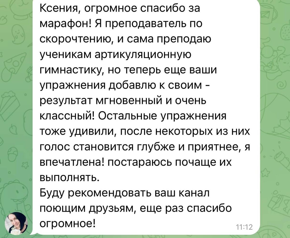 Недавно я проводила бесплатный марафон «Вокальная зарядка», в котором каждый день давала участникам универсальные упражнения для развития мышц голосового аппарата. Ведь если они не в здоровом тонусе - петь красиво точно не получится🗣️ После марафона было столько положительных отзывов, что я решила пойти дальше и придумала, как можно повысить эффективность каждой такой тренировки. Ответ прост - давать не одинаковые задания, а заточенные на решение конкретных вокальных проблем. Например, если у вас трудности с исполнением высоких нот - лучше всего поможет один тип упражнений, а если голос звучит пискляво - то совсем другой. Именно поэтому теперь каждый может заказать у нас составление своей персональной вокальной зарядки, направленной на решение ваших проблем с голосом. Для этого нужно всего лишь пройти небольшое тестирование. Пишите в комментариях ВОКАЛЬНАЯ ЗАРЯДКА, и мы пришлём подробности👌🏻