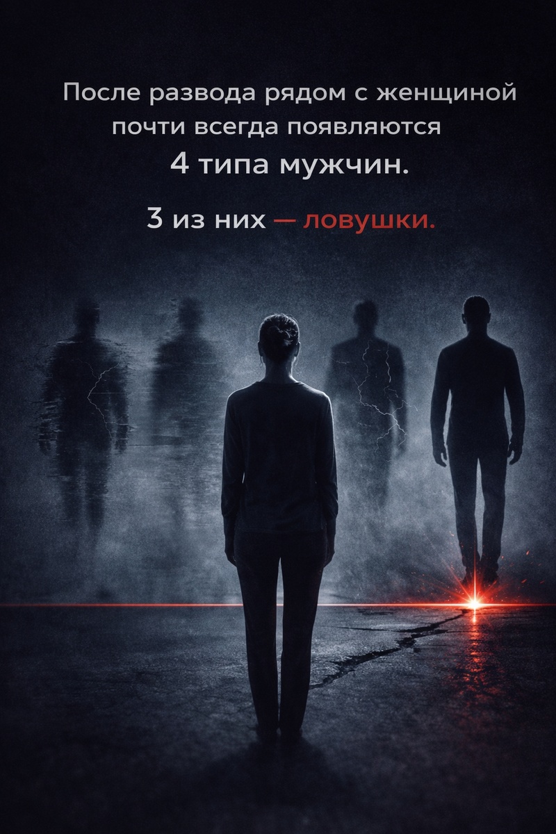 После развода женщина часто встречает четыре типа мужчин. Я замечаю одну закономерность, которая повторяется из года в год. Когда женщина завершает сложные отношения, через некоторое время вокруг неё появляются мужчины. И почти всегда это четыре типа. Этот сценарий так часто повторяется, что кажется, будто жизнь показывает одну и ту же пьесу с разными актёрами. Но суть остаётся неизменной. Три из этих типов — ловушки. Женщина вступает в новые отношения, ожидая чего-то нового, а через год-два осознаёт, что сценарий остался прежним, только в другой упаковке. Я хочу рассказать о четырёх типах мужчин, потому что, когда начинаешь их видеть, становится проще не терять время. ### Тип №1. Спасатель Спасатель появляется почти сразу. Он внимательный, заботливый, говорит правильные слова. Он смотрит на женщину, пережившую сложные отношения, и произносит: «Я бы никогда так с тобой не поступил», «Ты заслуживаешь лучшего», «С тобой плохо обращались». Спасатель может писать длинные сообщения, подолгу