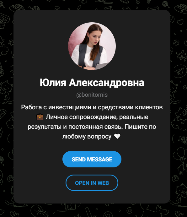 Любой уважающий себя финансовый институт гордится своей богатой историей, вывешивает на стены золотые лицензии, публикует ежеквартальные отчеты и демонстрирует лица своих руководителей. Но наши сегодняшние герои t me/bonitomis — люди исключительно стеснительные и скромные. Настолько скромные, что решили вообще не утруждать себя созданием официального сайта, канала или хотя бы публичной группы для общения с аудиторией. Вся так называемая «инвестиционная империя» сводится к одному-единственному профилю, за которым скрывается некая загадочная Юлия Александровна. Звучит невероятно солидно, не правда ли? Прямо как имя вашей строгой, но справедливой завуча в школе, которой на подсознательном уровне хочется доверять.