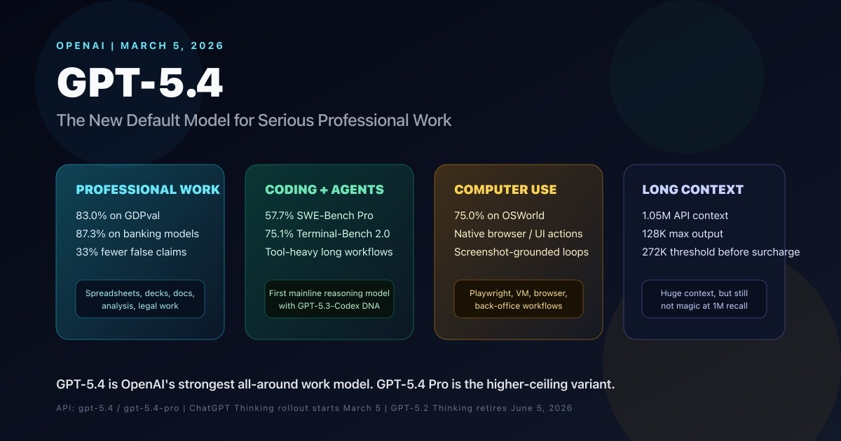 5 марта 2026 года OpenAI официально выпустила GPT-5.4 — новую флагманскую модель, которую сразу назвали «самой способной frontier-моделью для серьёзной профессиональной работы». Модель вышла в двух вариантах: GPT-5.4 Thinking (для глубокого рассуждения) и GPT-5.4 Pro (для максимальной производительности).