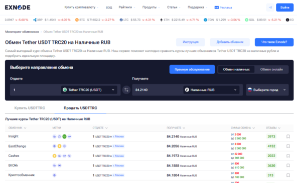 - Для удобства можно использовать Exnode — мониторинг обменников криптовалют.