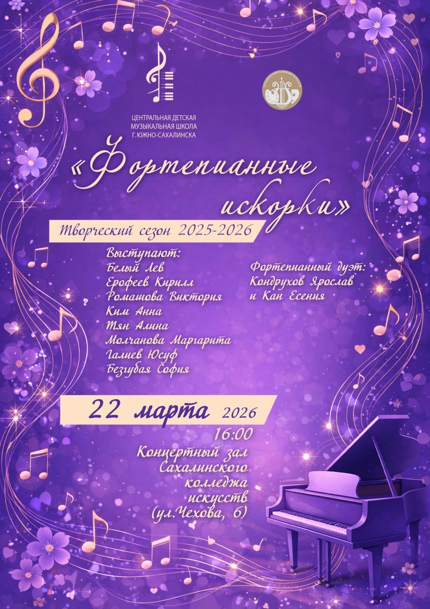 конкурса "Детско-юношеские ассамблеи искусств" (номинация "Фортепиано") и их друзей. 🕓 22 марта в 16:00 🏛Концертный зал Сахалинского колледжа искусств 🎫 Вход свободный 🎹 В программе: Ф.Шопен "Ноктюрн" (исп. Лев Белый) И.С.Бах "Инвенция" (исп. Кирилл Ерофеев) В.Гаврилин "Танец" (исп. Виктория Ромашова) Й.Гайдн "Соната" (исп. Ким Анна ) Ф.Мендельсон "Песня без слов" (исп. Алина Тян) С.Прокофьев "Прелюдия" (исп. Маргарита Молчанова) Ф. Мендельсон "Песня без слов" (исп. Юсуф Галиев ) Ф.Лист "Утешение" (исп. Софья Безгубая) Фортепианный дуэт Ярослав Кондрухов, Есения Кан В.А.Моцарт "Рондо" и С.Рахманинов "Вальс" В.Гаврилин "Галоп" Преподаватели: Кузьмина Т.М., Козленко Н.В., Шокина Т.В., Коровникова О.В., Каргаполова Г.С., Астахова Е.Ю. Дизайн афиши: Владимир Ижендеев @cdmshsakhalin|#афишаЦДМШ