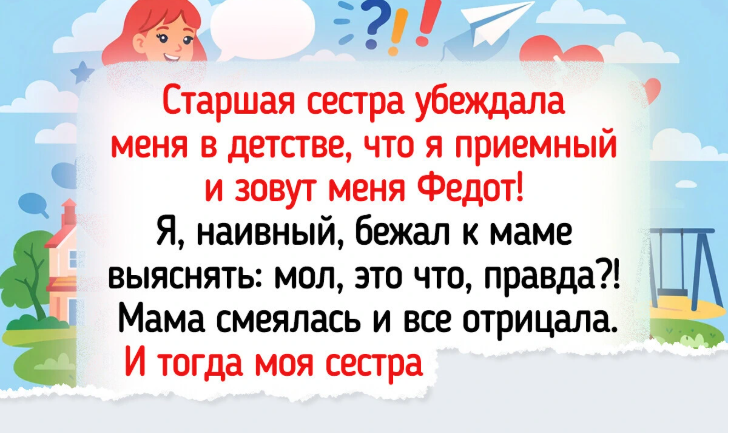 - Старшая сестра убеждала меня в детстве, что я приемный и зовут меня Федот! Я, наивный, бежал к маме выяснять: мол, это что, правда?! Мама смеялась и все отрицала. И тогда моя сестра продолжала в том же духе: «Ну а ты думал, что мама признается? Она так ответила, чтобы тебя не ранить». Ну, сестра! © kartaaev