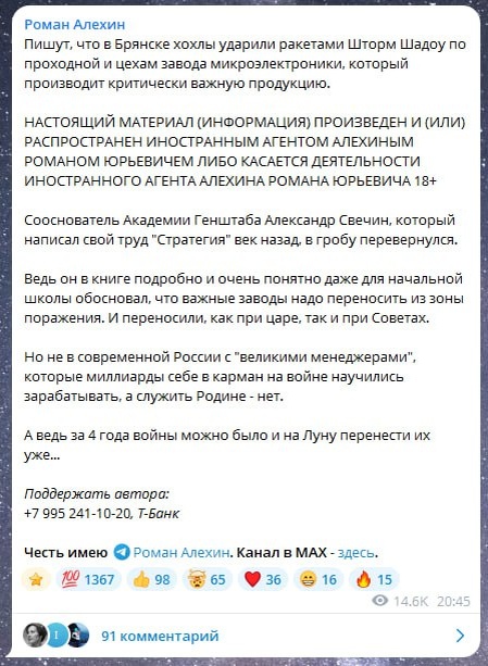 Брат-близнец Взрывателя мостов суньцзы Подоляки. В смысле, духовный. Поскольку тоже доносит свое личное нахрен никому не сдавшееся мнение в виде истины в последней инстанции. Осмелюсь свои 5 евроцентов вставить. В 1958 году, когда завод запускали, Брянск не то чтобы глубоким тылом был. Но был. Долететь до него с территории противника могла разве что какая-нибудь межконтинентальная дрянь. Ну так она с таким же успехом и до Новосибирска с Красноярском долетела бы. Причем как с запада, так и с востока. А сейчас, когда дроны долетают даже до Казани, куда прикажете все переносить? В Воркуту и Норильск? Взрывая, разумеется, за собой все мосты. Так и там в Карском море может всплыть какая-нибудь АПЛ типа "Огайо", груженая Томагавками. Дятел, заводы за Урал переносили не для того, чтобы туда какая-нибудь дрянь не долетела. А чтобы при внезапных прорывах (какой, к примеру, случился в июне 1941) не остаться без стратегического сырья, материалов и технологий. Но даже в те заповедные времена,