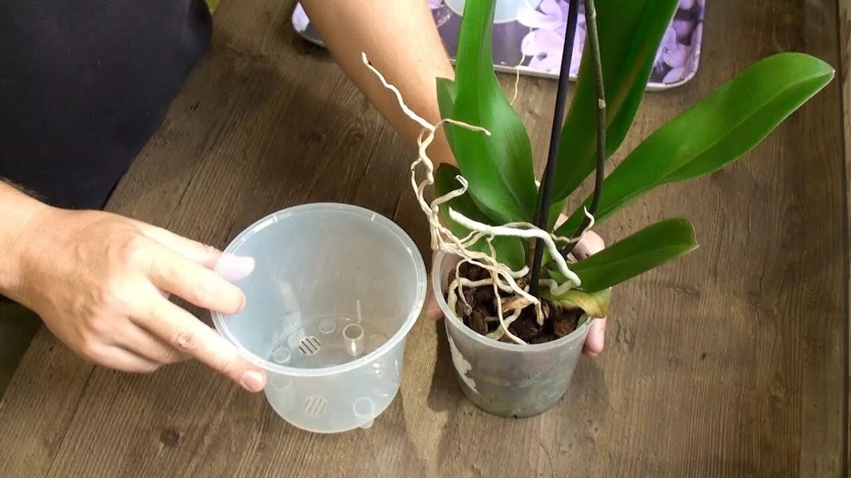 1. Размягчение. За час до пересадки обильно полейте орхидею или замочите горшок в теплой воде на 15–20 минут. Корни станут эластичными, как плотные шнурки, и меньше будут ломаться.