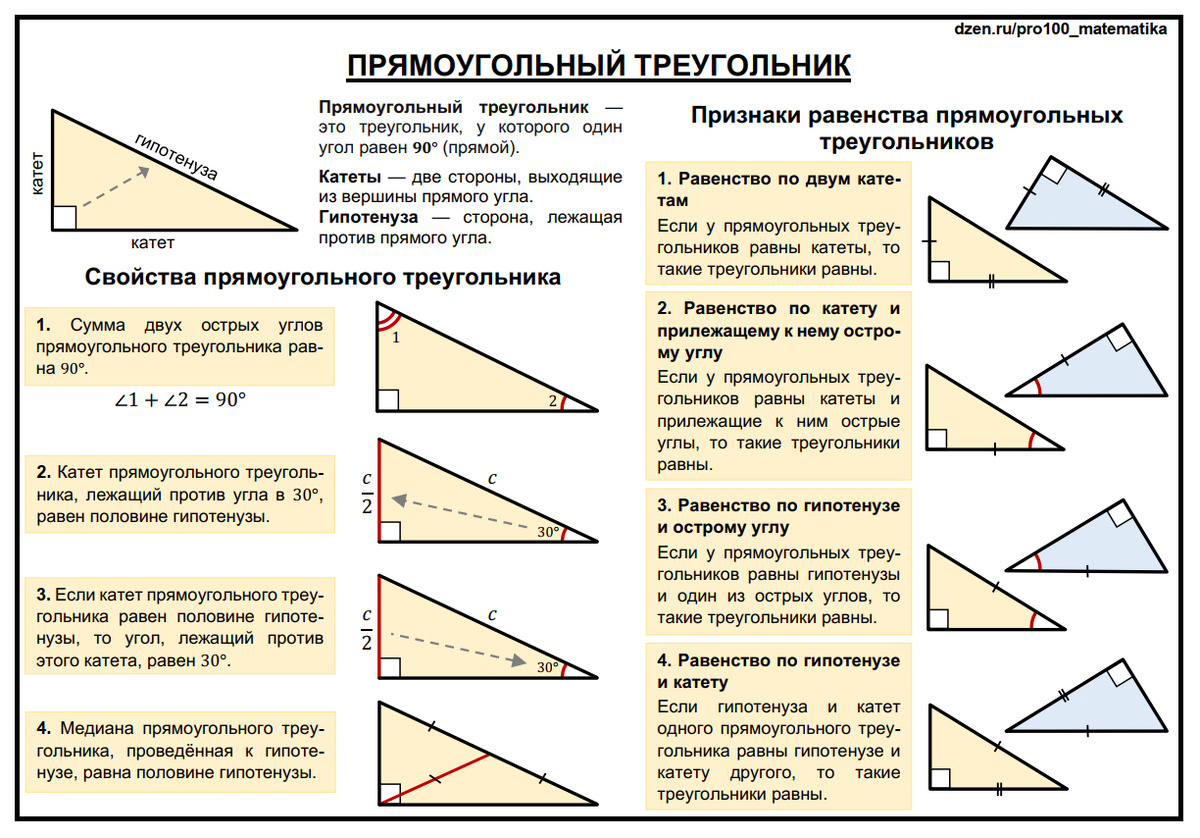 - Существует 4 признака равенства прямоугольных треугольников — их важно не просто выучить, а понимать.