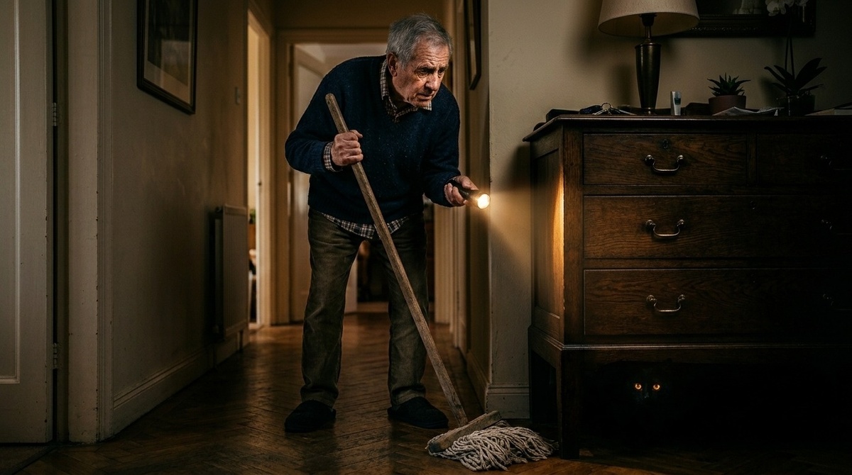 «Уберите эту животину немедленно, пока я сам его не вышвырнул!» — дед громыхал деревянной шваброй под старым дубовым комодом, пытаясь вытолкать оттуда перепуганного черного кота.