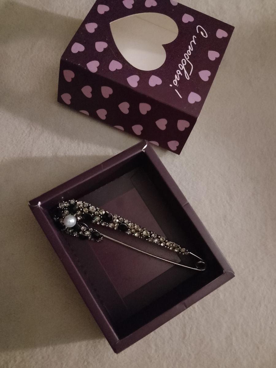 Ну что говорить, чувство прекрасного, конечно, имеется. Пришлось откупаться от неё бижутерией. Отдала брошку в виде булавки с камешками. Все равно не пользуюсь. Пусть у кошечки тоже свои украшения будут.