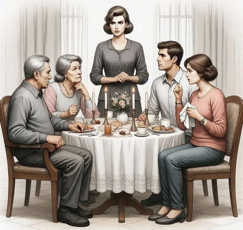 За столом сидели все: Анна, Михаил, их сын Игорь с женой Вероникой и дочь Лиза. Вероника, высокая, с идеально уложенными волосами и холодным взглядом, заговорила первой — без предисловий, будто зачитывала приговор: