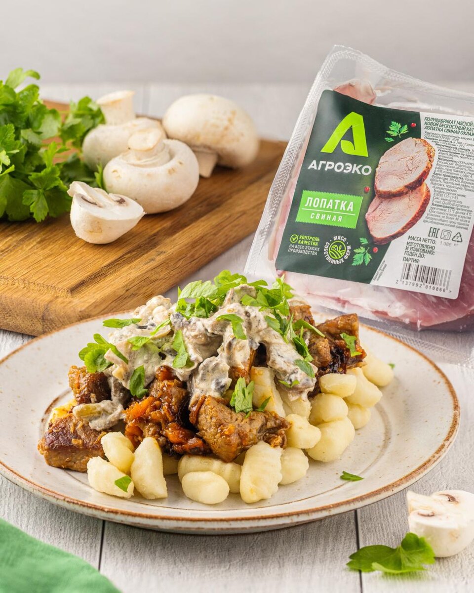 Картофельные клецки с тушёной свининой и грибным соусом — это сытное и вкусное блюдо, которое лучше всего приготовить самостоятельно дома. Нежная лопатка аппетитно томится с ароматными овощами, клецки варятся быстро, а грибной соус дарит удовольствие на этапе дегустации. Как результат — восхитительное блюдо в центре стола, которое притягивает всю семью к ужину. Ингредиенты (4 порции) * Лопатка АГРОЭКО — 1 упаковка * Лук — 1 шт. * Морковь — 1 шт. * Чеснок — 2 зубчика * Мука — 1 ст. л. * Бульон — 400 мл * Томатная паста — 1 ч. л. (по желанию) * Лавровый лист — 1 шт. * Масло растительное — 1–2 ст. л., соль, перец Клецки — 1 упаковка Грибной соус: * Шампиньоны — 300 г * Лук — 1 шт. * Сливки 20% — 200 мл * Масло сливочное — 30 г + 1 ст. л. растительного * Соль, перец, петрушка для подачи Приготовление 1. Нарежьте лопатку кубиками и обжарьте до румяности, добавьте лук и морковь, затем чеснок и муку. Влейте бульон, выложите пасту и лавровый лист. Тушите под крышкой 60–75 мин до мягкости овощ