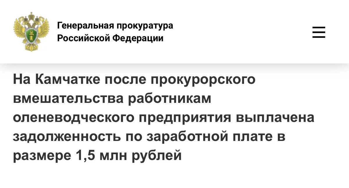 Прокуратура Петропавловска-Камчатского провела проверку исполнения законодательства об оплате труда в ГУП «Производственное объединение оленеводческо-промысловых предприятий Камчатского края». Установлено, что перед 18 работниками организации образовалась задолженность по заработной плате за февраль 2026 года в размере 1,5 млн рублей. С целью устранения выявленных нарушений прокуратура внесла руководителю предприятия представление. После вмешательства надзорного ведомства задолженность по заработной плате погашена.
