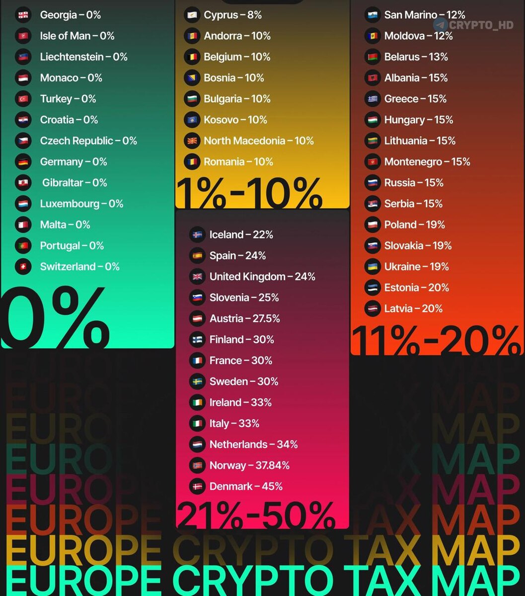 : ▪Грузия: 0% ▪Остров Мэн: 0% ▪Лихтенштейн: 0% ▪Монако: 0% ▪Турция: 0% ▪Хорватия: 0% ▪Чехия: 0% ▪Германия: 0% ▪Гибралтар: 0% ▪Люксембург: 0% ▪Мальта: 0% ▪Португалия: 0% ▪Швейцария: 0% ▪Кипр: 8% ▪Андорра: 10% ▪Бельгия: 10% ▪Босния: 10% ▪Болгария: 10% ▪Косово: 10% ▪Северная Македония: 10% ▪Румыния: 10% ▪Сан-Марино: 12% ▪Молдова: 12% ▪Беларусь: 13% ▪Албания: 15% ▪Греция: 15% ▪Венгрия: 15% ▪Литва: 15% ▪Черногория: 15% ▪Россия: 15% ▪Сербия: 15% ▪Польша: 19% ▪Словакия: 19% ▪Украина: 19% ▪Эстония: 20% ▪Латвия: 20% ▪Исландия: 22% ▪Испания: 24% ▪Великобритания: 24% ▪Словения: 25% ▪Австрия: 27.5% ▪Финляндия: 30% ▪Франция: 30% ▪Швеция: 30% ▪Ирландия: 33% ▪Италия: 33% ▪Нидерланды: 34% ▪Норвегия: 37.84% ▪Дания: 45% Crypto Headlines