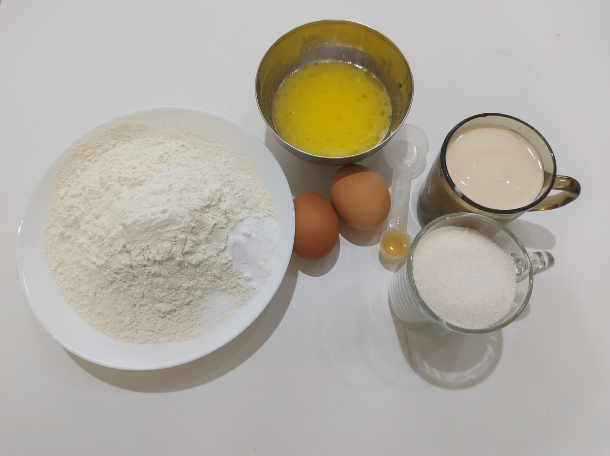 1. К кефиру (у меня была ряженка) комнатной температуры добавляем яйца, сахар, соль, ванильный сахар (по