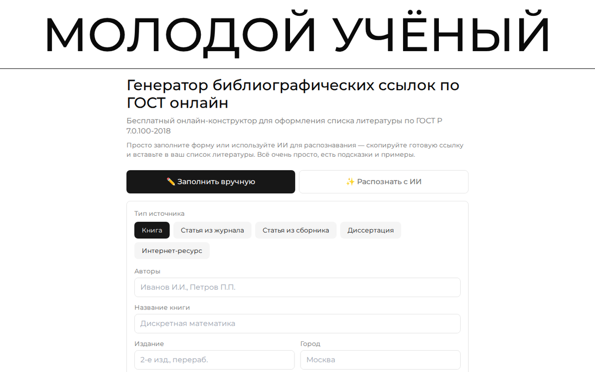 Генератор «Молодой учёный» — бесплатный онлайн-конструктор по ГОСТ Р 7.0.100-2018